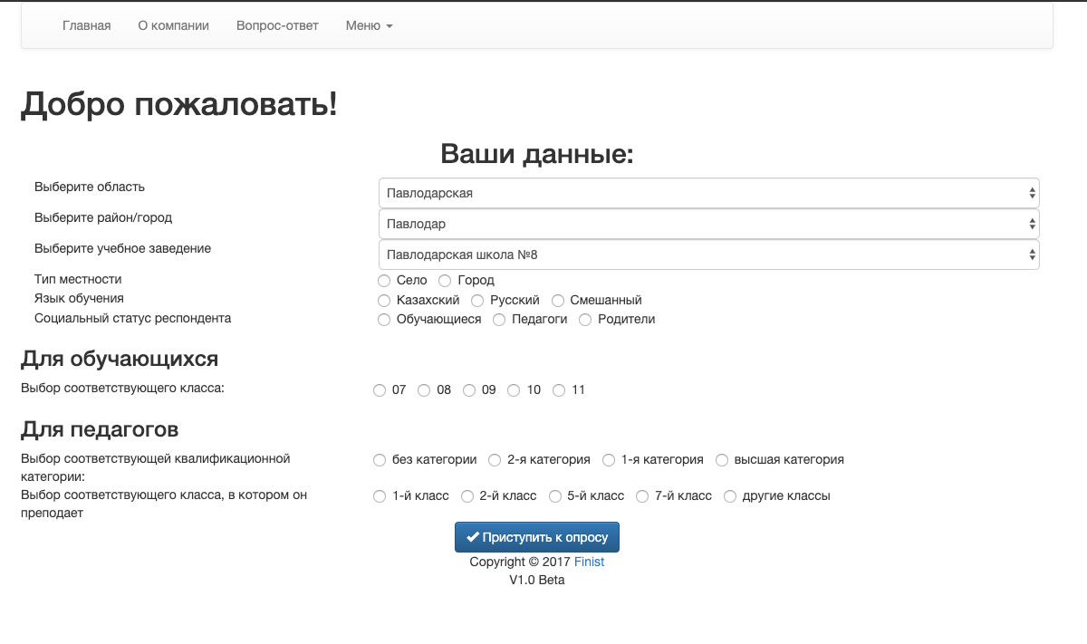Онлайн анкетирование позволяет значительно снизить затраты на опрос, расширить географию, сэкономить время, получить результаты быстро и в нужном формате. Этот проект создан в период работы в компании «Финист». В этой компании я научился всем главным основополагающим концепциям, необходимым для разработки сайтов, мобильных приложений и десктопных приложений. За что очень благодарен сотрудникам компании «Финист» и особенно моему непосредственному руководителю. Это наш лидер, вдохновитель и учитель — Кубрак Алексей. Это приложение создавалось в команде, моё участие оценил-бы в процентов 90%. Именно в этих онлайн-опросах пришлось хорошенько попрактиковать запросы SQL. Технологии Kohana(php), javascript, bootstrap-4, flexbox