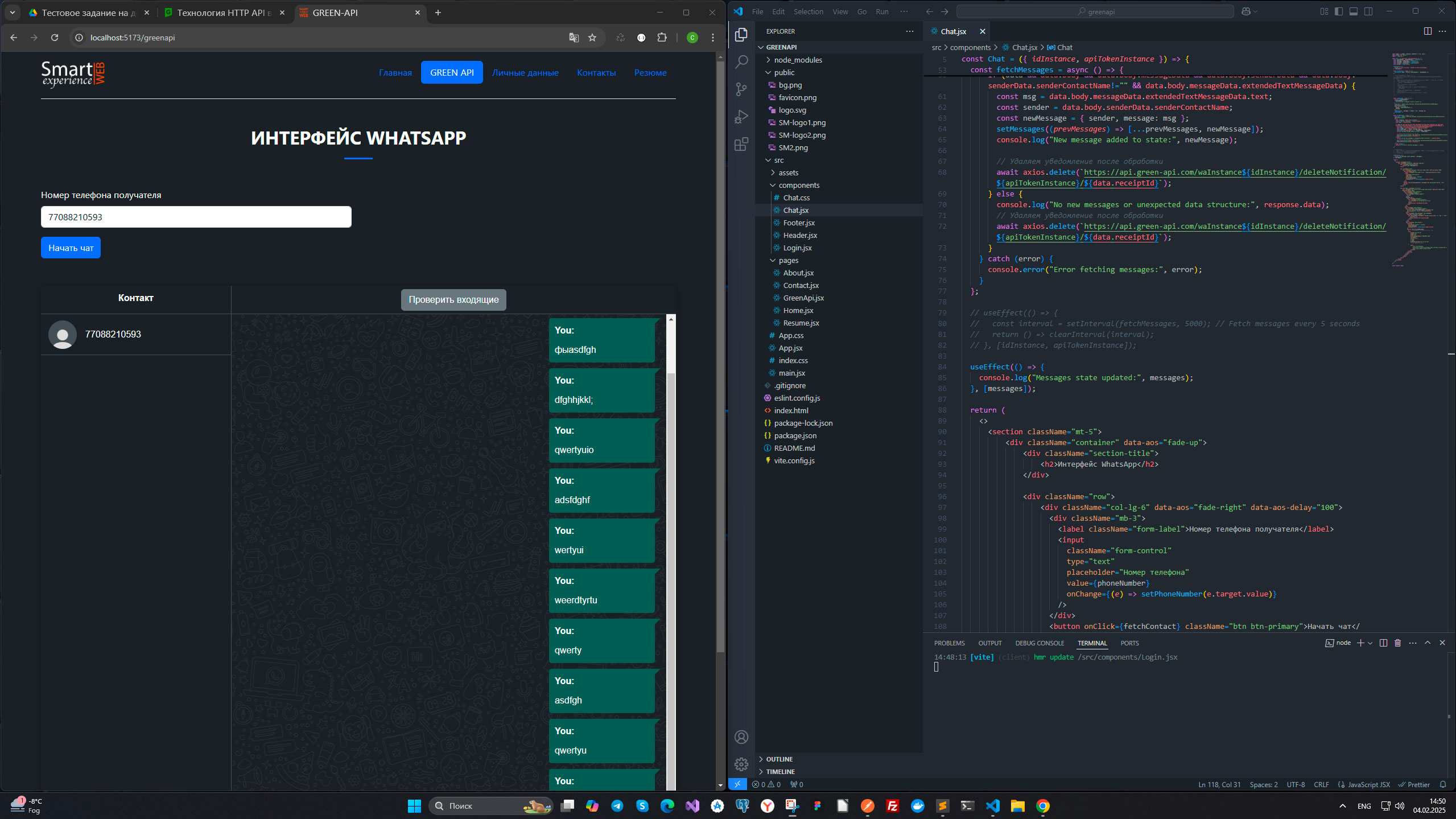 Этот проект разработан с целью создать пользовательский интерфейс для отправки и получений сообщений WhatsApp. Ознакомиться с сервисом Green API.